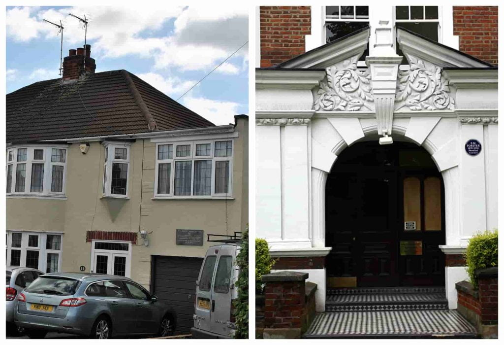 Right: Arlington Park Mansions. Left: Robert and May Buckingham’s house. Forster lived and died at this house, the home of his friends. The sign above the garage door marks the 100th anniversary of his birth.