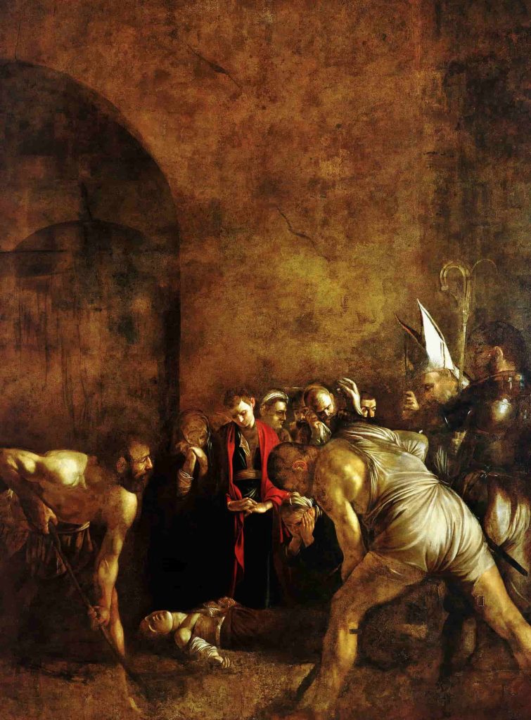 The only person who seems to experience genuine grief is an elderly woman, kneeling beside Lucy’s body, who, in disbelief and dismay in the face of the saint’s violent death, has her hands on her face, with a gesture very similar to one already proposed by Caravaggio in a female figure present in the scene of the ‘Beheading of the Baptist’.