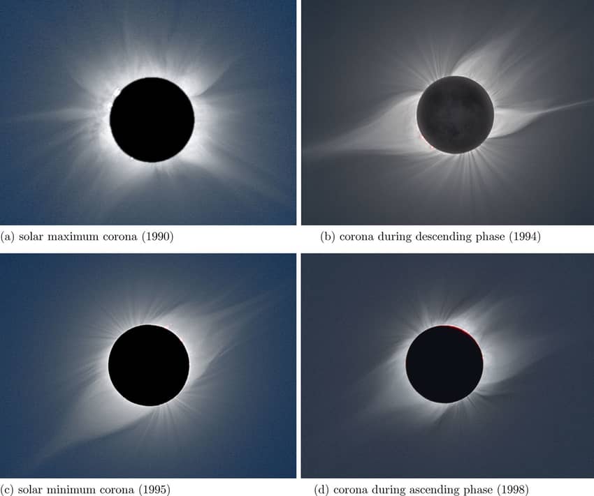 Images of total solar-eclipse corona at four different phases of a solar cycle. Source: the MMV project website of Prof. M. Druckmüller