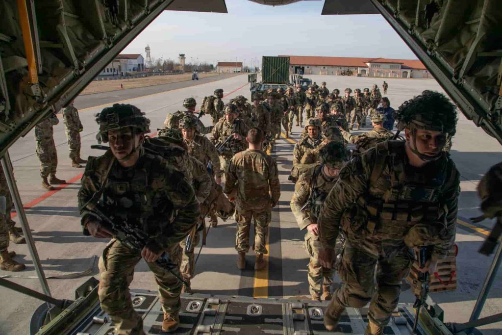 US paratroopers of 2nd Battalion, 503rd Infantry Regiment depart Italy for Latvia, 23 February 2022. Thousands of US troops were deployed to eastern Europe amid Russia’s military build-up.