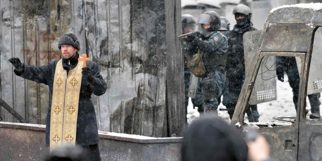 An Orthodox priest tries to stop clash protesters the police in the center of Kiev on January 22, 2014. Photo: AFP