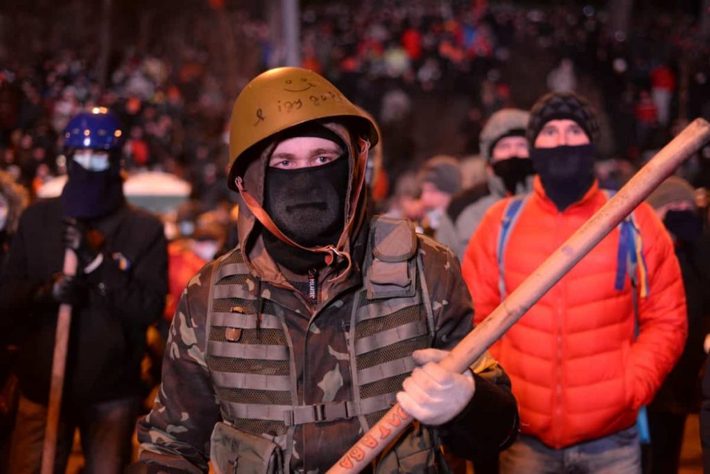 Masked protesters armed with shovels on Dynamivska street during Euromaidan Protests. Photo: Mstyslav Chernov CC BY-SA 3.0