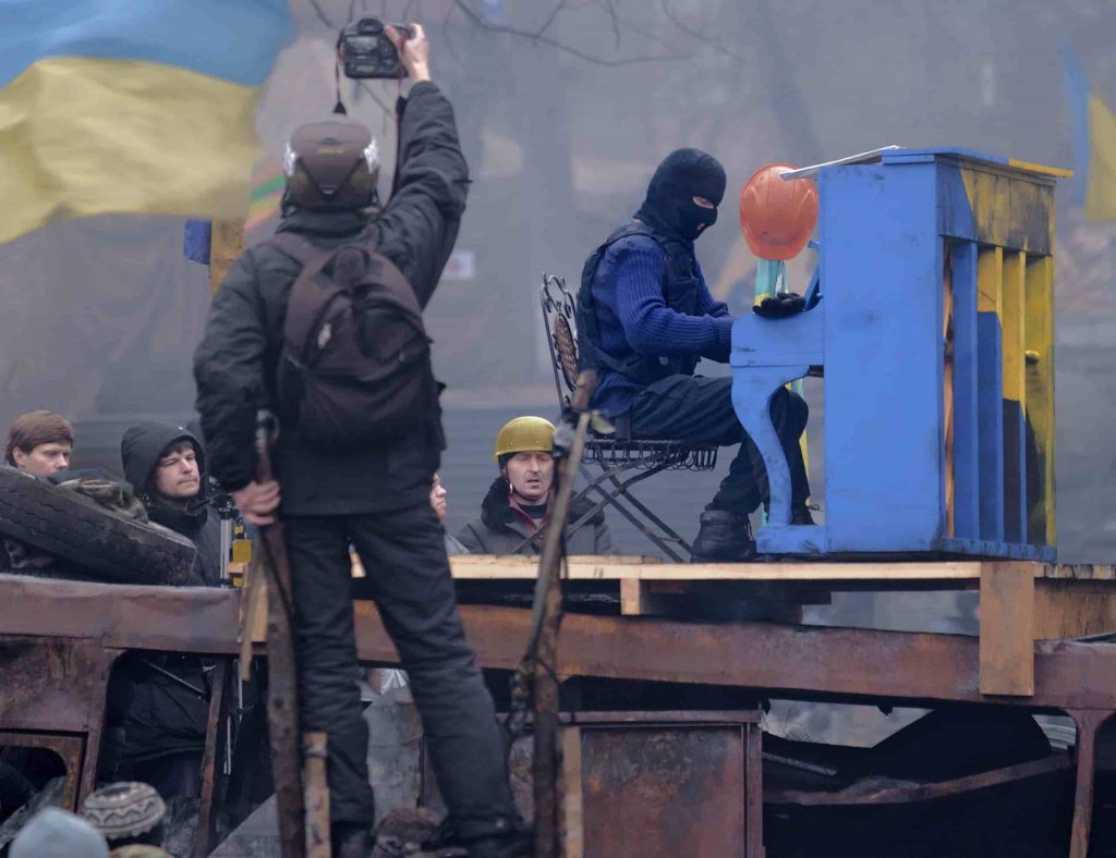 A Euromaidan protester (Piano Extremist) is playing piano on the roof of a burned Berkut bus. The barricade across Hrushevskoho str. Kiev, 10 February 2014. Photo: Ввласенко CC BY-SA 3.0