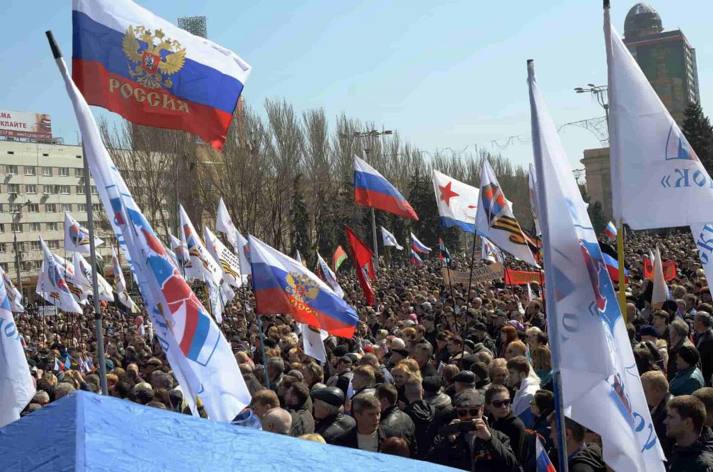 Pro-Russian rally in Donetsk on April 6, 2014. CC BY-SA 3.0