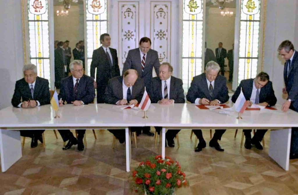 Ukrainian President Leonid Kravchuk (second from left seated), Chairman of the Supreme Council of the Republic of Belarus Stanislav Shushkevich (third from left seated) and Russian President Boris Yeltsin (second from right seated) during the signing ceremony to eliminate the USSR and establish the Commonwealth of Independent States. Photo: Russian International News Agency (RIA Novosti)