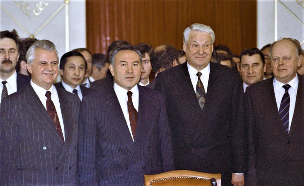 Russian President Boris Yeltsin (second right), Ukrainian President Leonid Kravchuk (left), Kazakh President Nursultan Nazarbayev (second left) and Speaker of Belarusian Supreme Soviet (Parliament) Stanislav Shushkevich (right) after signing Protocol on Establishing the Commonwealth of Independent States (CIS). Photo: Russian International News Agency (RIA Novosti)