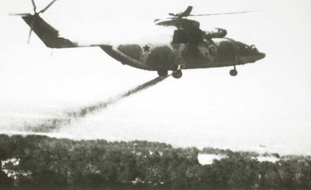 A Soviet Mi-26 Halo helicopter participating in the Chernobyl nuclear reactor clean-up operation.