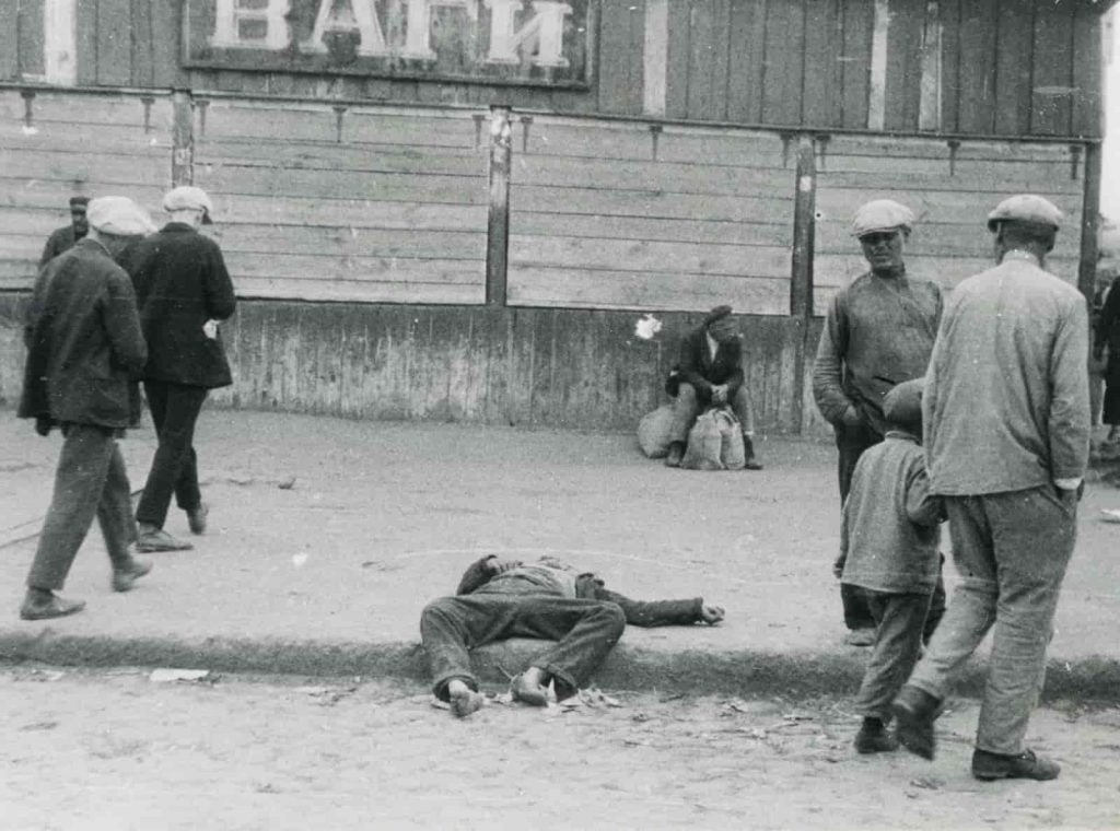 Passers-by and the corpse of a starved man on a street in Kharkiv, 1932.