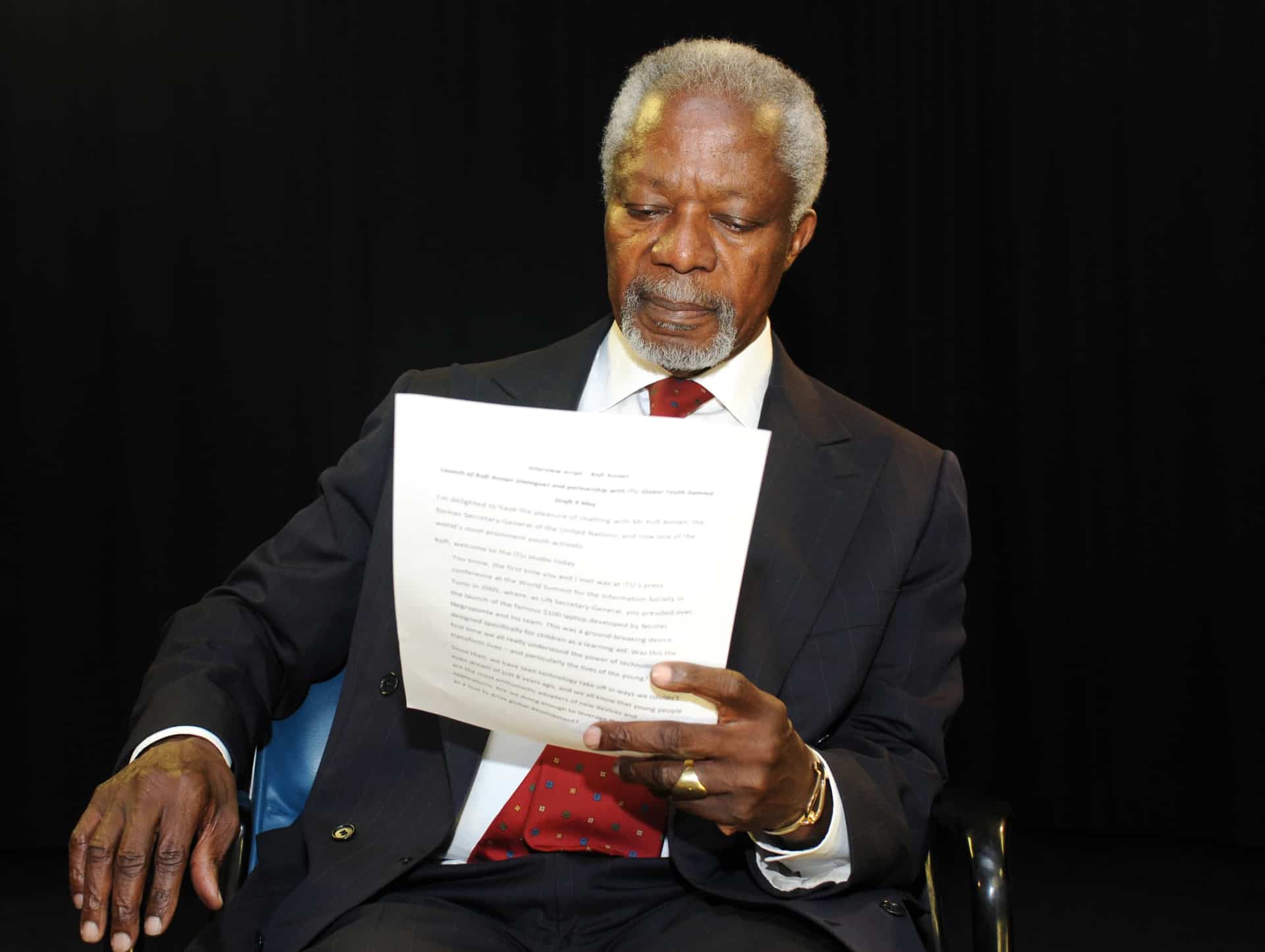 Kofi Annan preparing for an interview at ITU TV Studio in 2013. He served as the Secretary-General from 1997 to 2006. Photo by Claudio Montesano Casillas / ITU