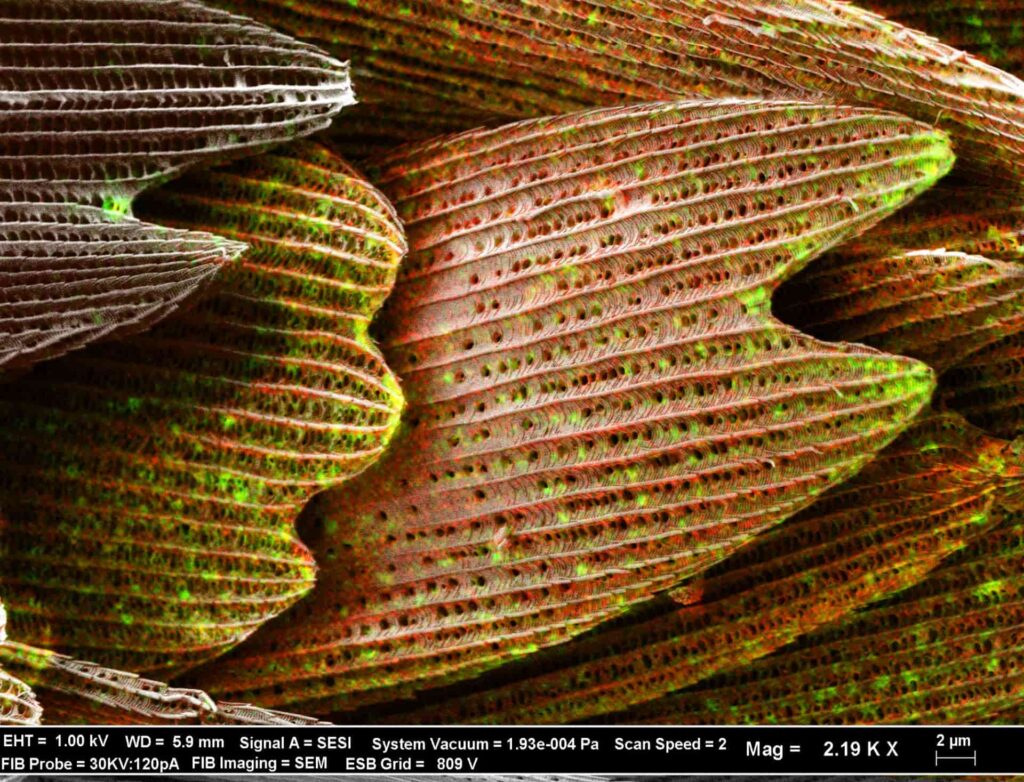 2. Butterfly wing: Thousands of pigmented scales cover butterfly wings, giving the insect its magnificent colourful appearance. Photo: Zeiss Microscopy/CC BY-NC-ND 2.0