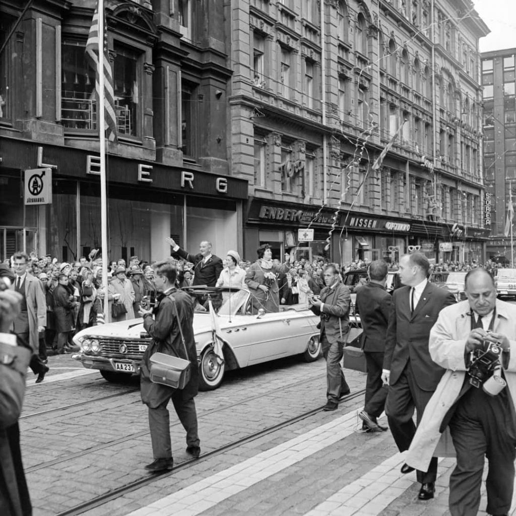 The Vice-President of the United States, Lyndon B. Johnson, and his wife and daughter in a convertible driving down Aleksanterinkatu in Helsinki, 1963. © CC2.0