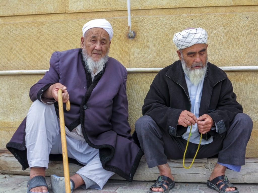 Older Turkmen men gather in front of the mosque an hour before the prayer. They sit and exchange conversations until the prayer starts.