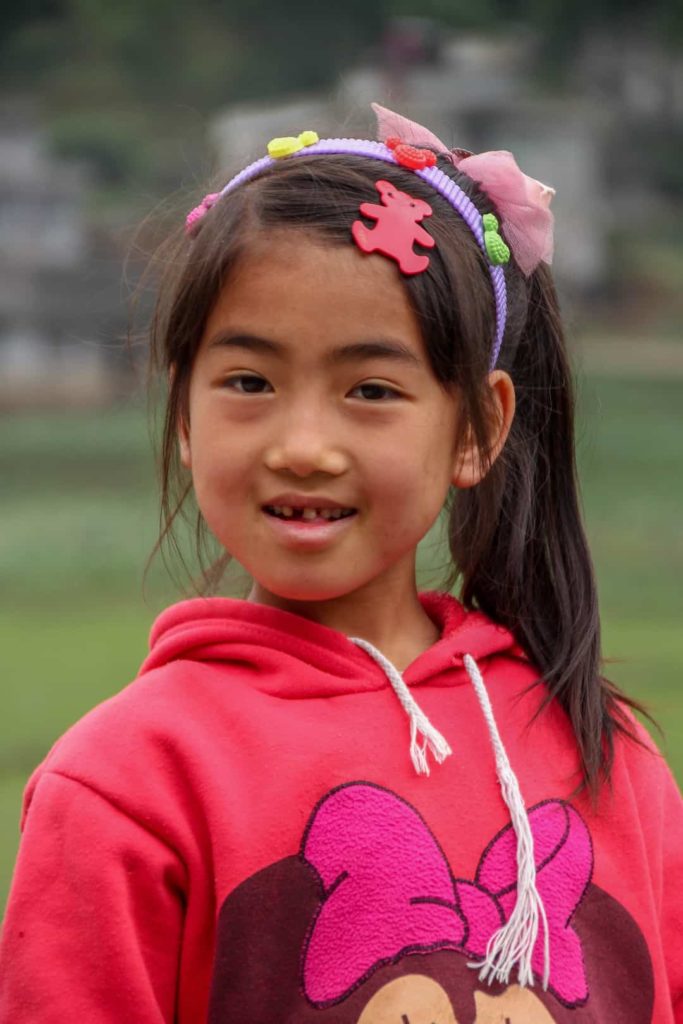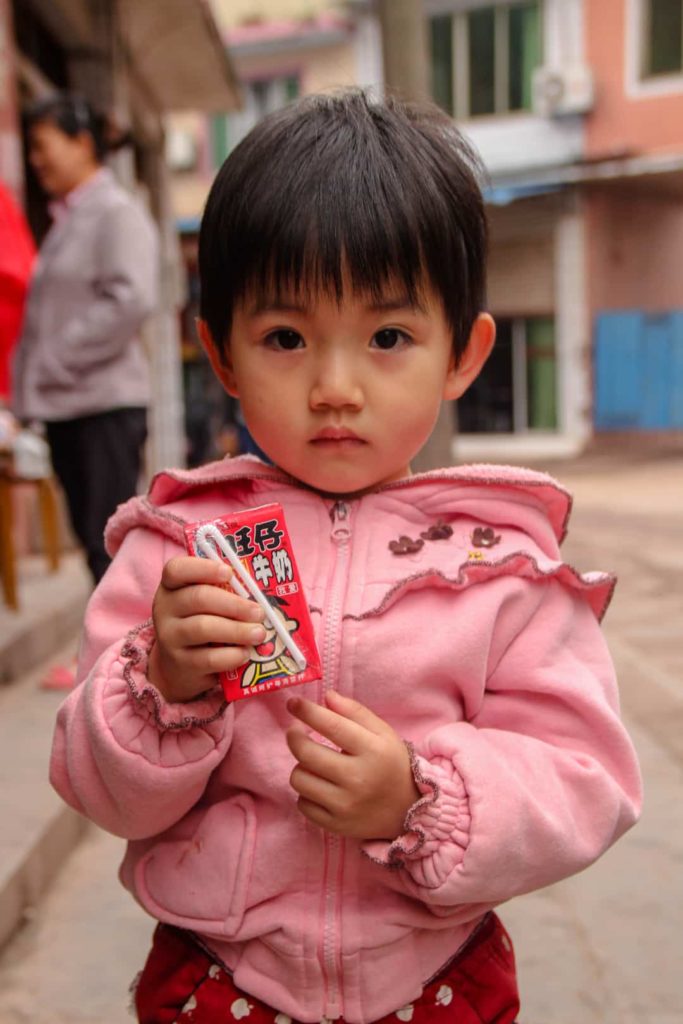 A little girl from the ancient town of Fubao models with her juice. © Jonna Lappalainen