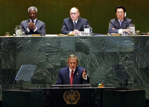 Bush addressing the UN General assembly in 2002 a year before he invaded Iraq
